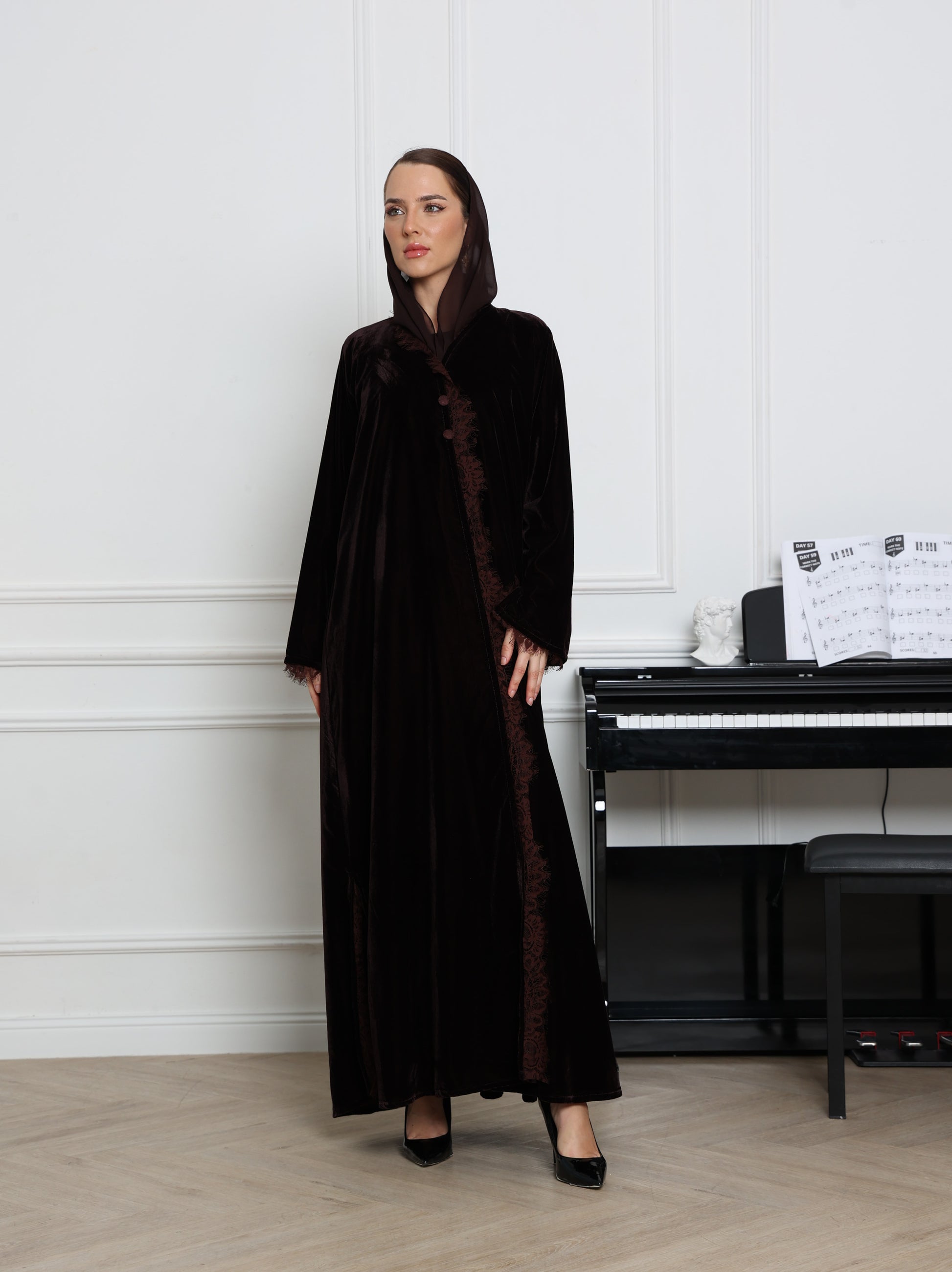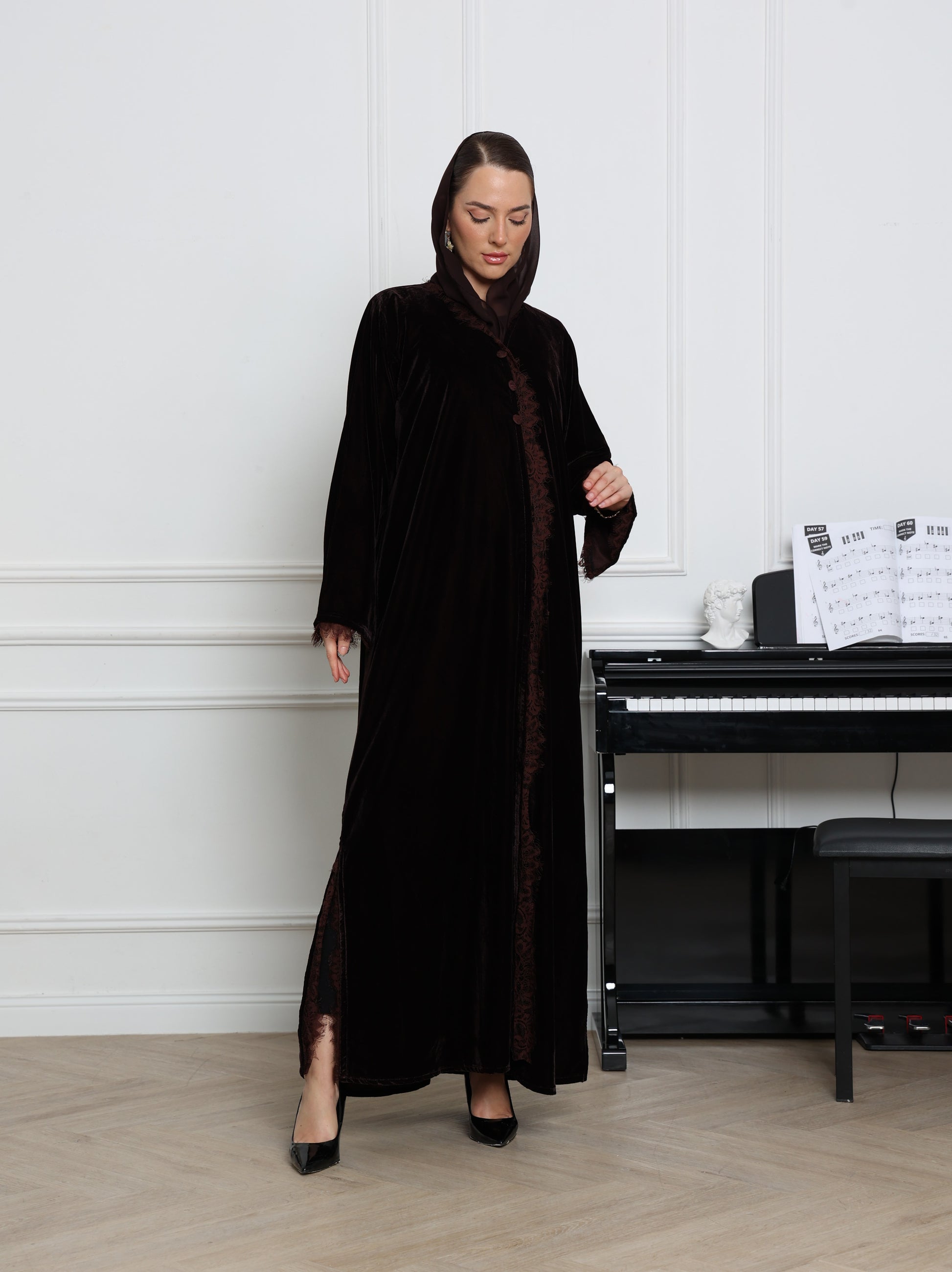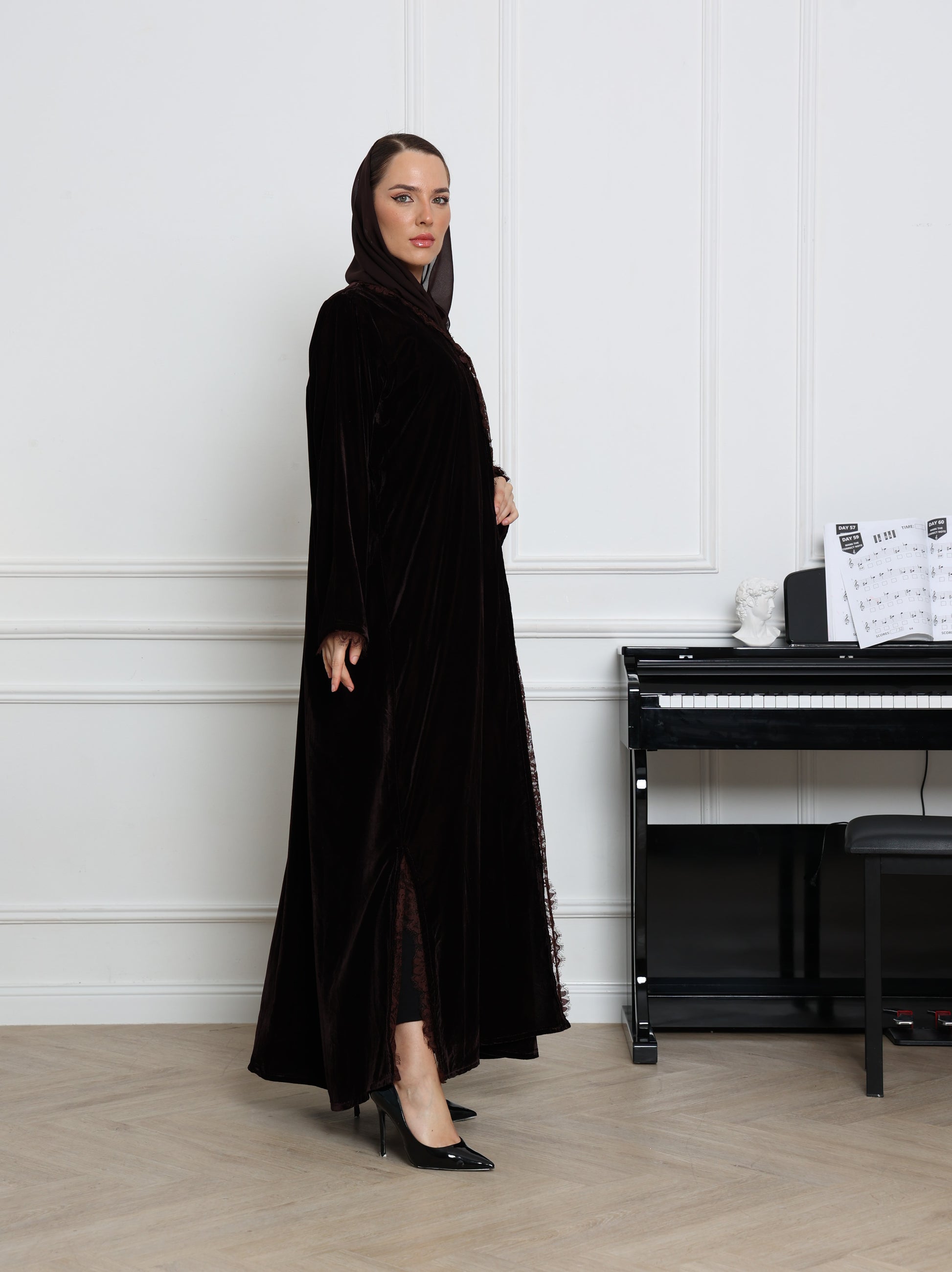 A brown velvet abaya defined by a soft drape and subtle contrast detailing with lace Elegant, composed, and effortless for refined day-to-evening wear