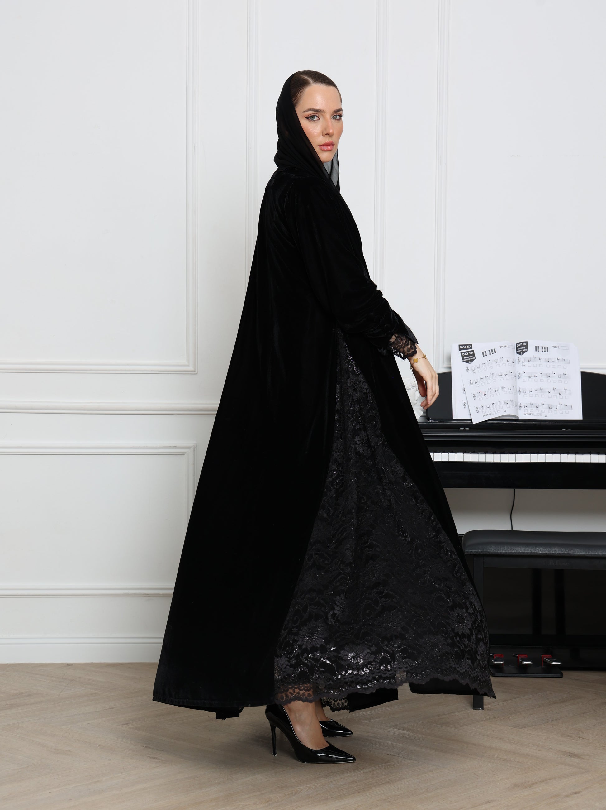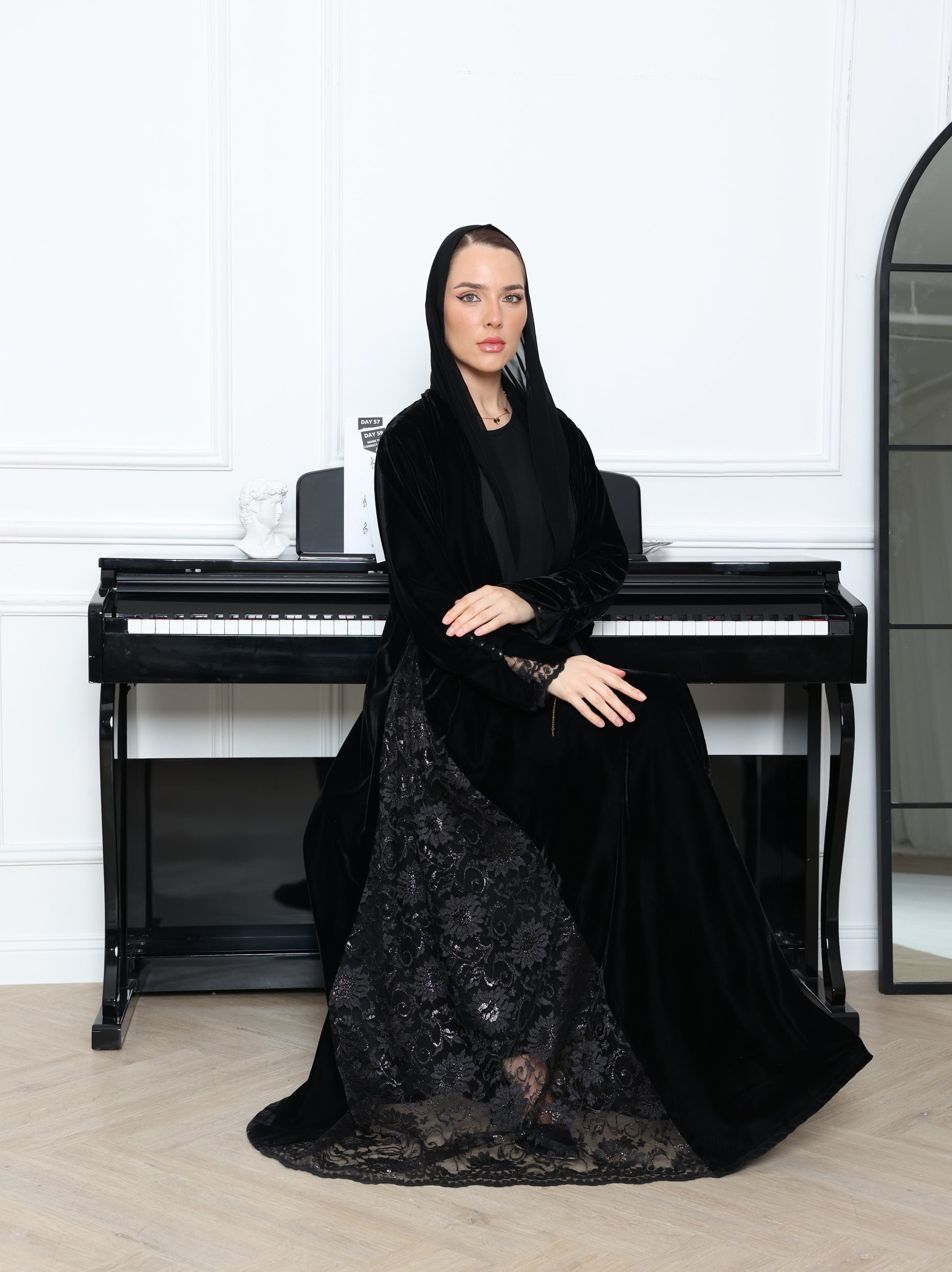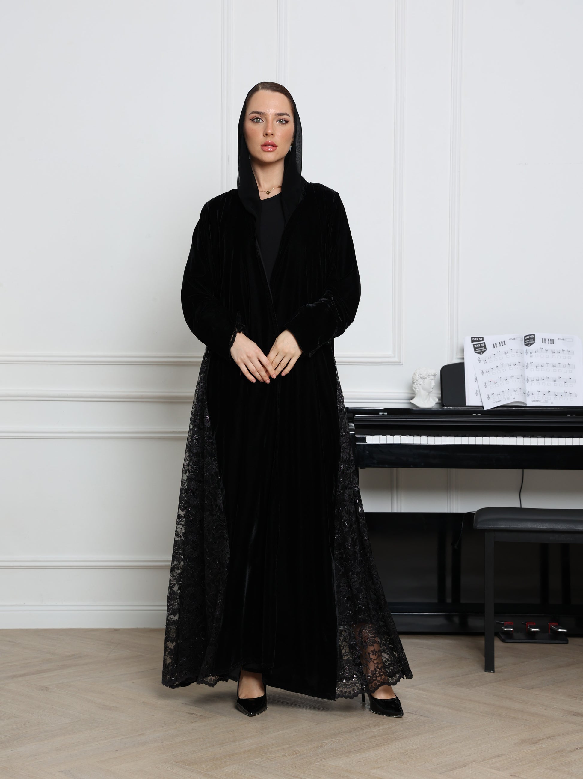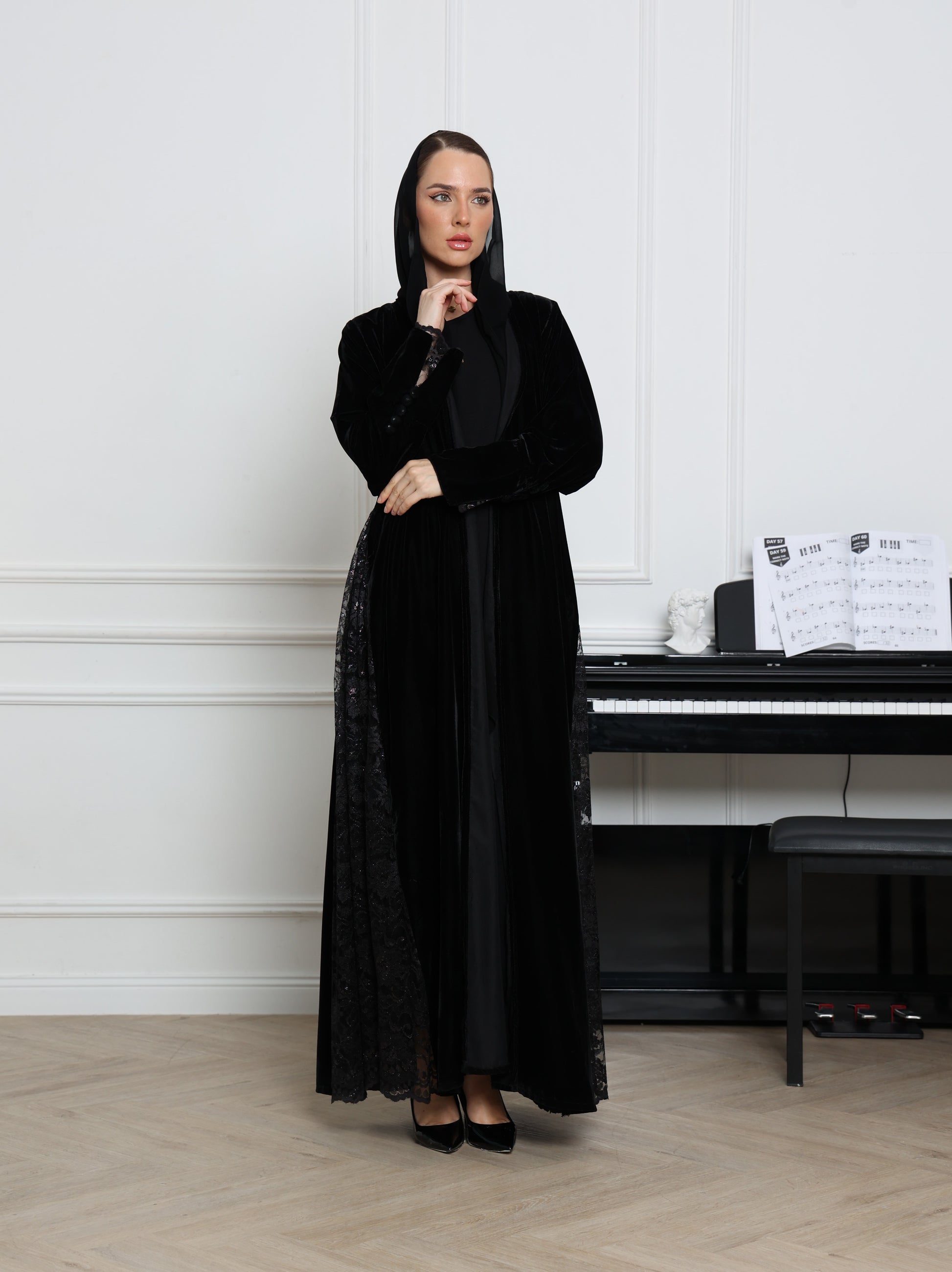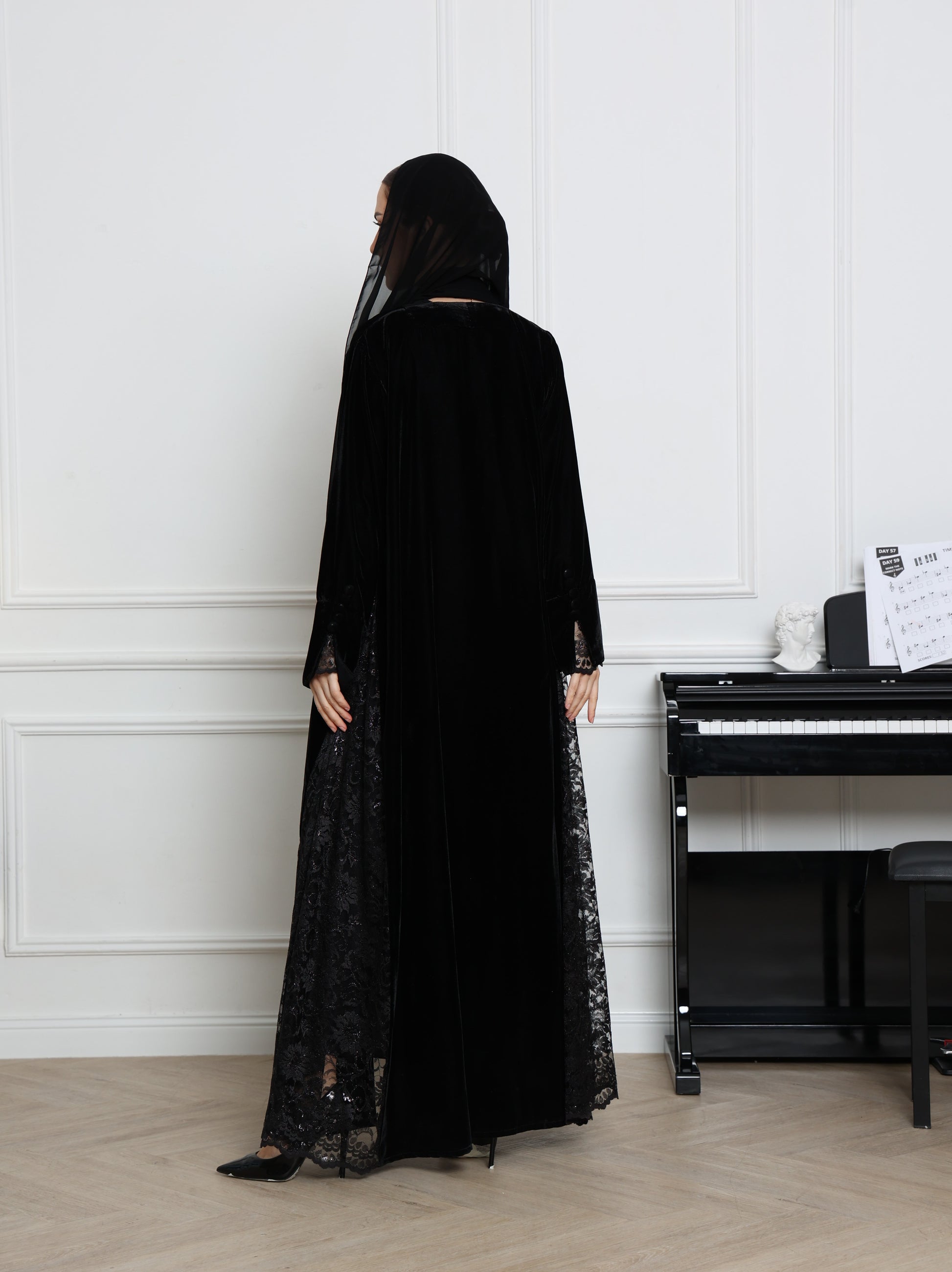 This refined black abaya is crafted from soft velvet, offering a rich texture and graceful drape. Designed with sheer lace side panels, it creates subtle movement and contrast while maintaining a timeless silhouette. The open-front cut allows for versatile styling, making it suitable for both formal occasions and elevated everyday wear.